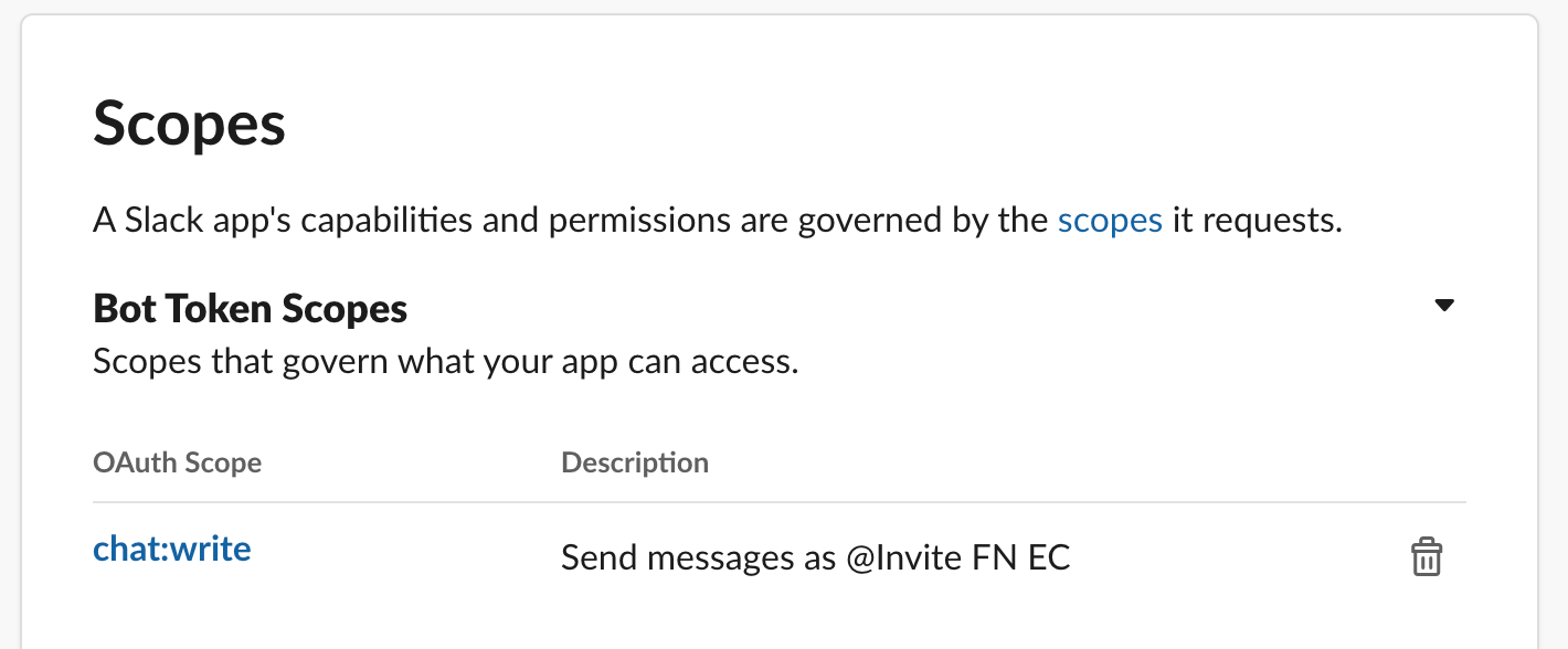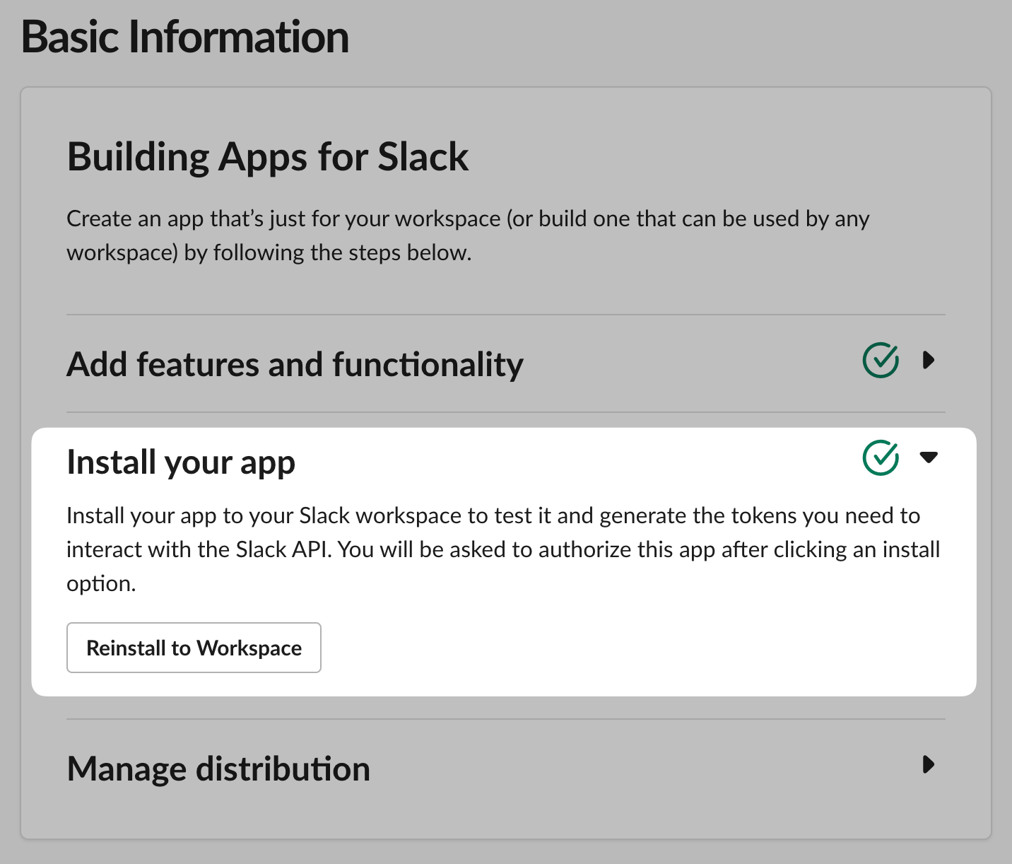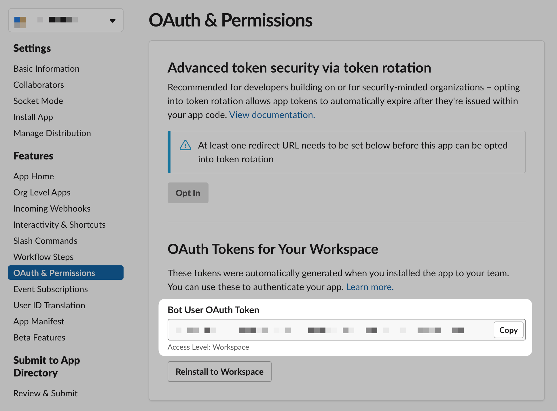 Install the app in your workspace: You'll need to install the app in your workspace for it to work. Click the "Install to Workspace" button in the Slack admin UI to do this. Mine says "Reinstall" because I've already installed it.
