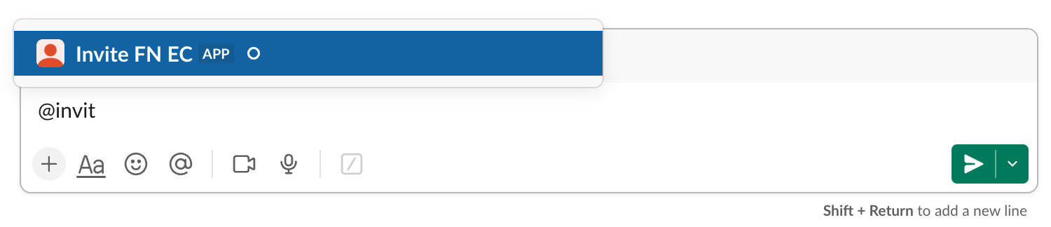 Invite the Bot to a Channel: To enable your Slackbot, invite it to the desired channel using the @<botname> command. In the screenshot below, my bot's name actually starts with the word invite, but if your bot is called mycoolbot you would invite it with @mycoolbot. This ensures your Slackbot has the required permissions to interact with the channel.