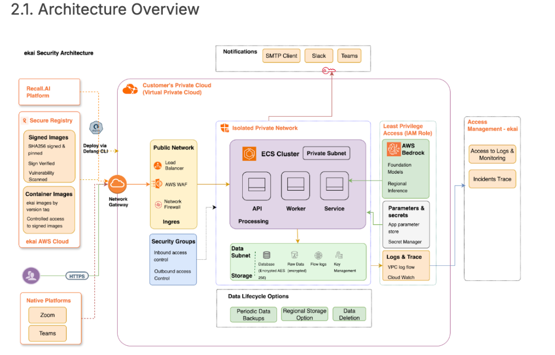 With Defang, ekai defines its application once in Docker Compose. Defang turns that definition into a production-ready deployment inside the customer's own cloud account. Compute, storage, networking, IAM roles, security groups, and even managed LLMs are provisioned automatically, following best practices for each cloud. For example, on AWS, the Defang deployment for ekai uses a variety of native services such as ECS, ELB, WAF, RDS, Bedrock and more to produce a secure, scalable, and cost-efficient deployment that conforms to the AWS well-architected framework.