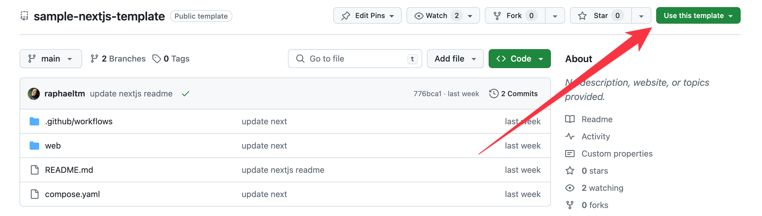 If you look through our GitHub organization, you'll start seeing loads of repos with the structure sample-<sample_name>-template. If you open them, you can create a new repo by clicking this button: